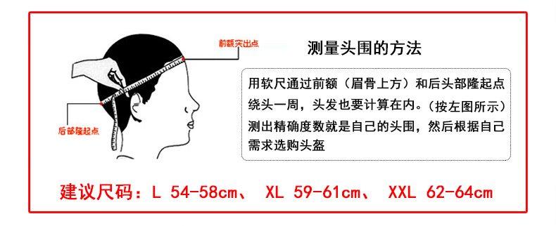 尺码: L 适合56—58cm, XL适合59—60cm, XXL适合61—63cm.