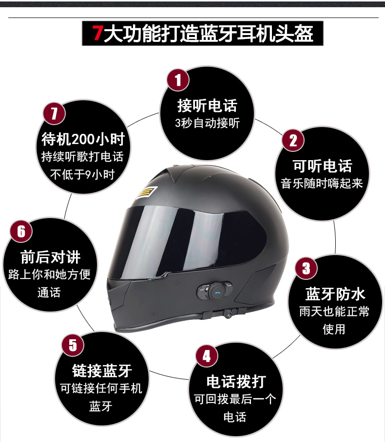 头盔特点: 蓝牙音质非常好,可以接一部手机,或者和同款头盔蓝牙相互链接。