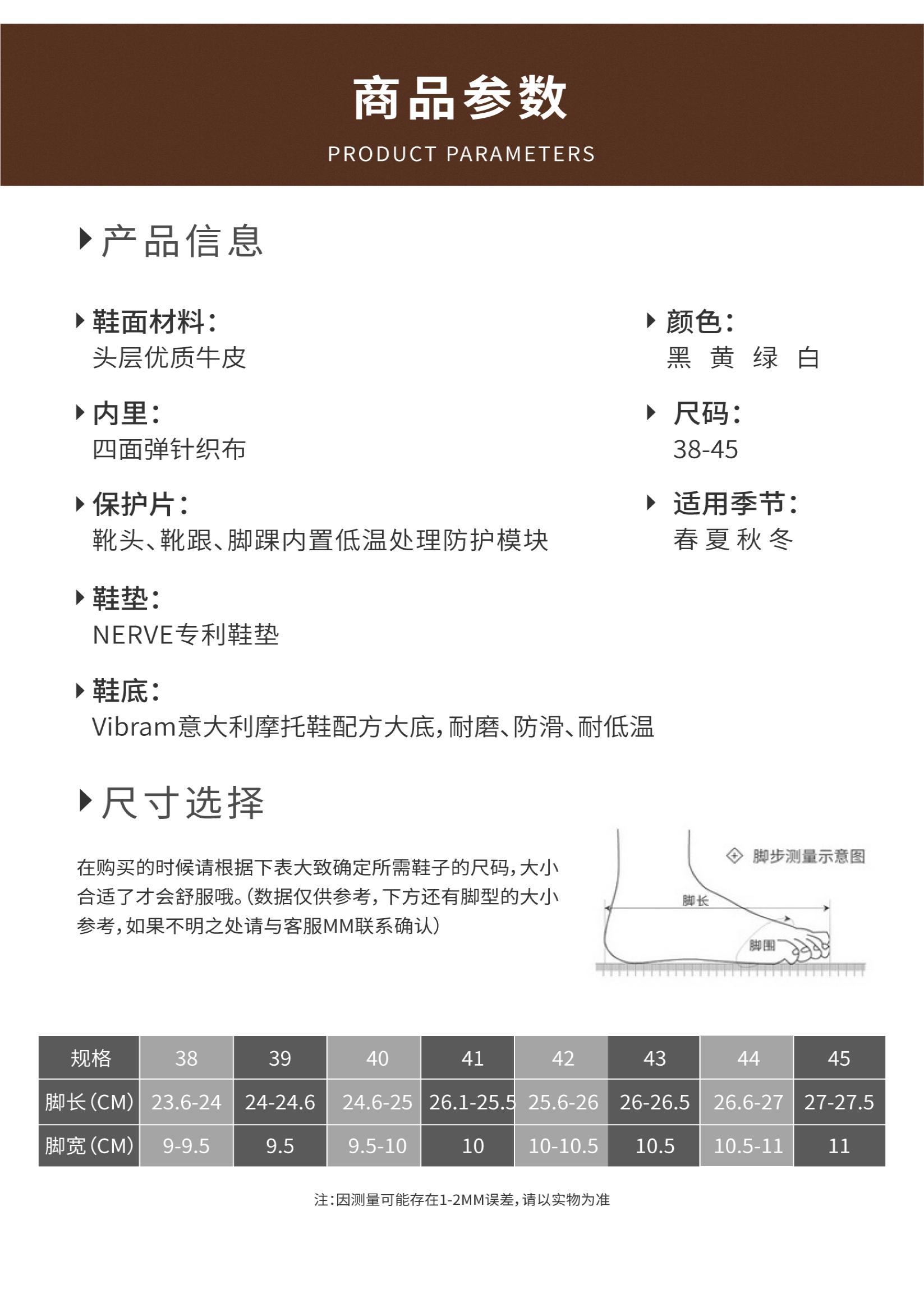 颜色:黄色、黑色、白色、绿色 尺码:38、39、40、41、42、43、45 特点:意大利Vibram大底,头层牛皮材质,多层弹力蜂箱鞋垫