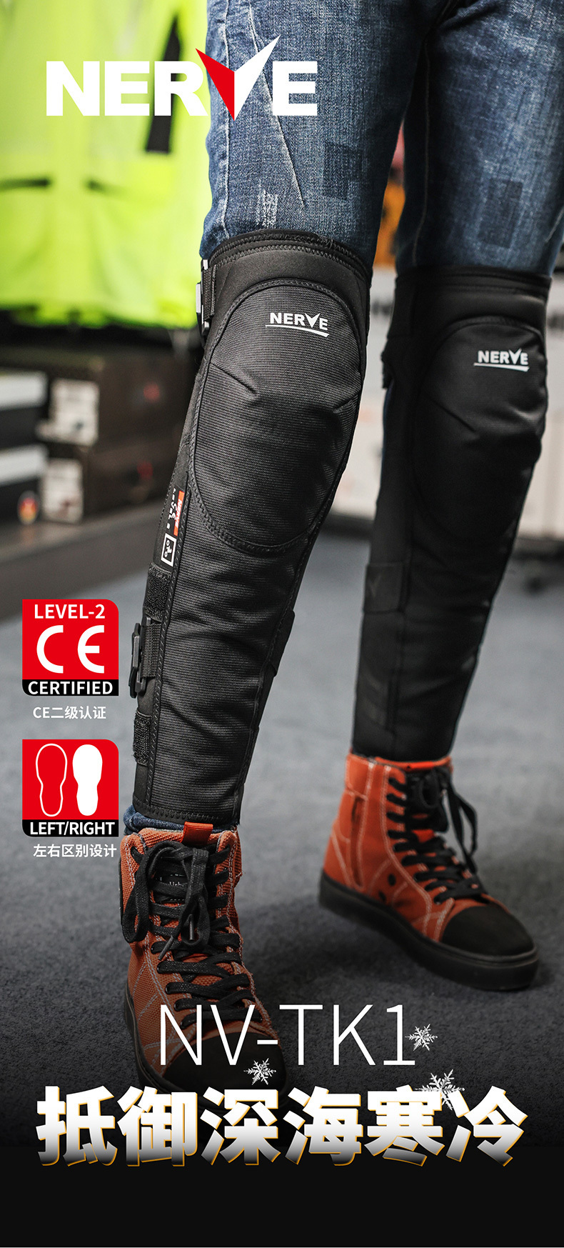 1、专业CE2级防护护具,适用范围-20℃~+40℃,低温环境防护性能稳定;2、潜水服材质,抵御深海寒冷;3、全弹力结构,可根据腿围自由调节,M码调节范围34cm-48cm,L码调节范围40cm-60cm(大腿围),行走无下坠。